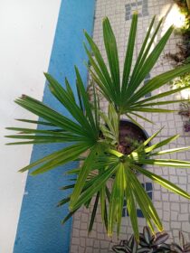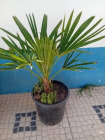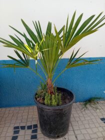 PALMEIRA MOINHO DE VENTO Trachycarpus fortunei com cerca de 50cms de altura em vaso de 27cms de diametro. A palmeira-moinho-de-vento (Trachycarpus fortunei) é uma espécie, ornamental, nativa de regiões temperadas e subtropicais da China, Japão, Birmânia e Índia.